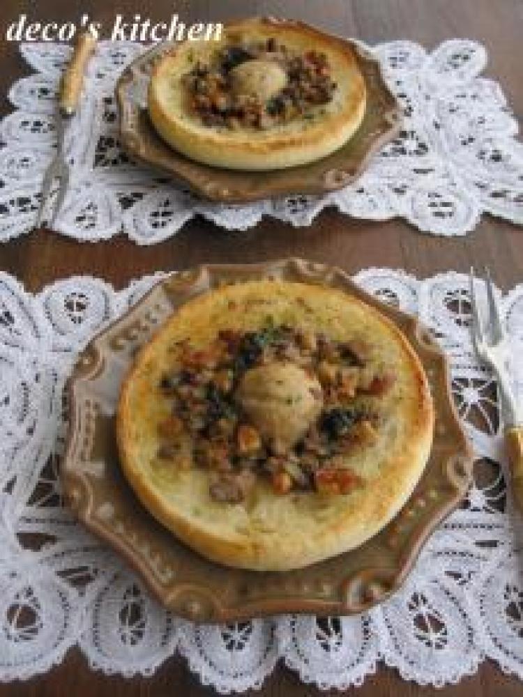 マフィンの真ん中に、まるごとのマッシュルームを乗せ、周りをマッシュルームのソテーで囲む。