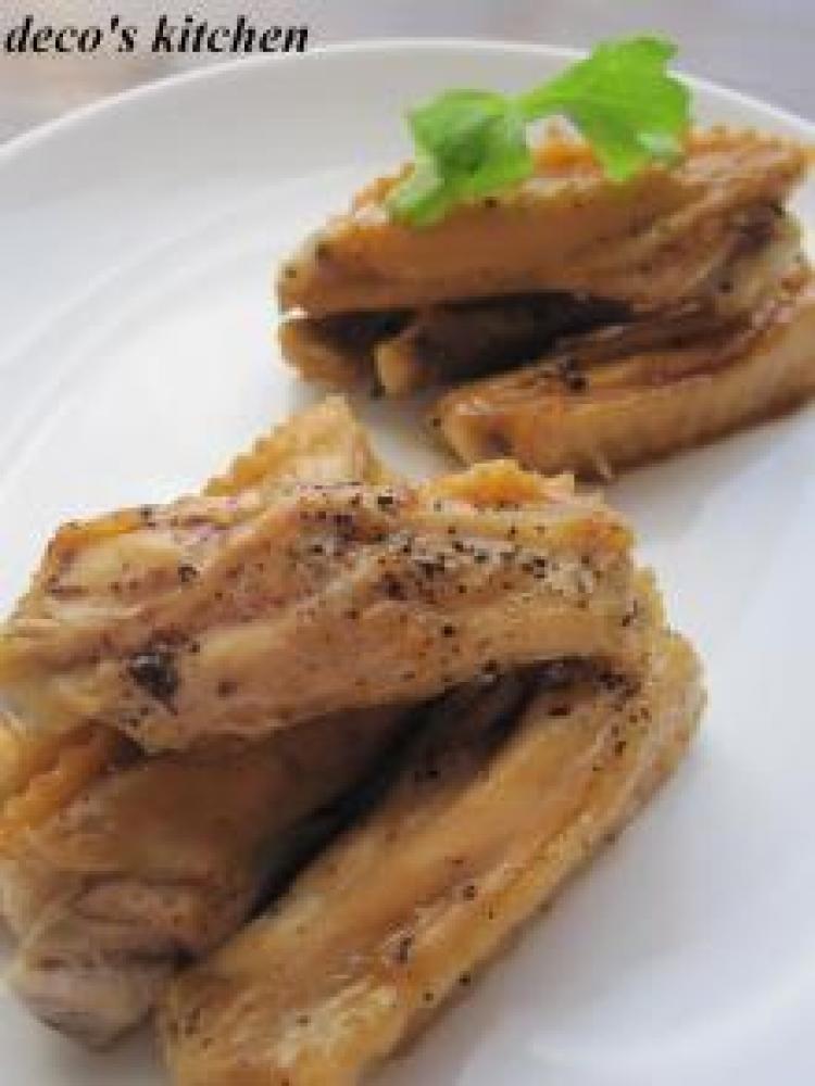 皮目にフォークをところどころさし、味がしみこみやすくする。塩と粗引き黒こしょうをふり、軽くもみ込む。(