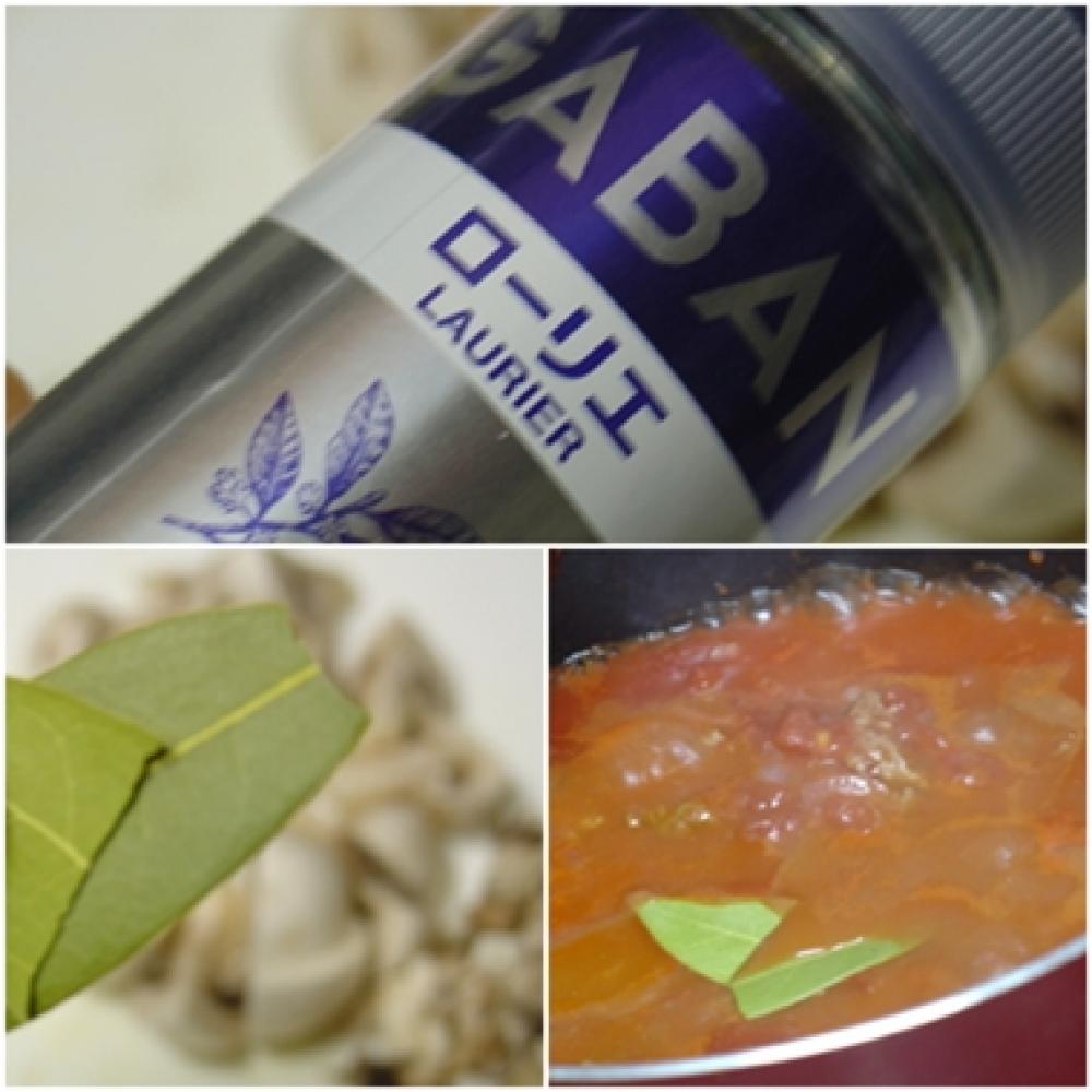 ![]() 玉ねぎの「かさ」が半分くらいになったら、カットトマトとローリエを入れて、ことこと10分ほど煮詰めます。