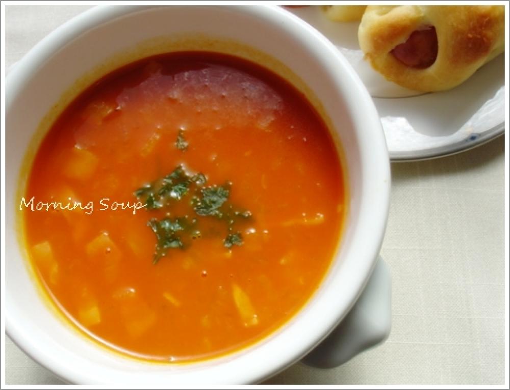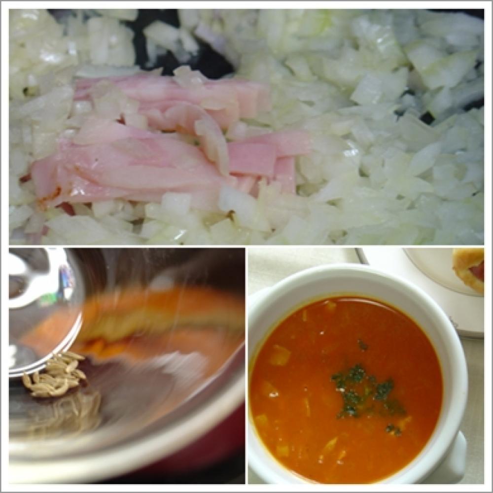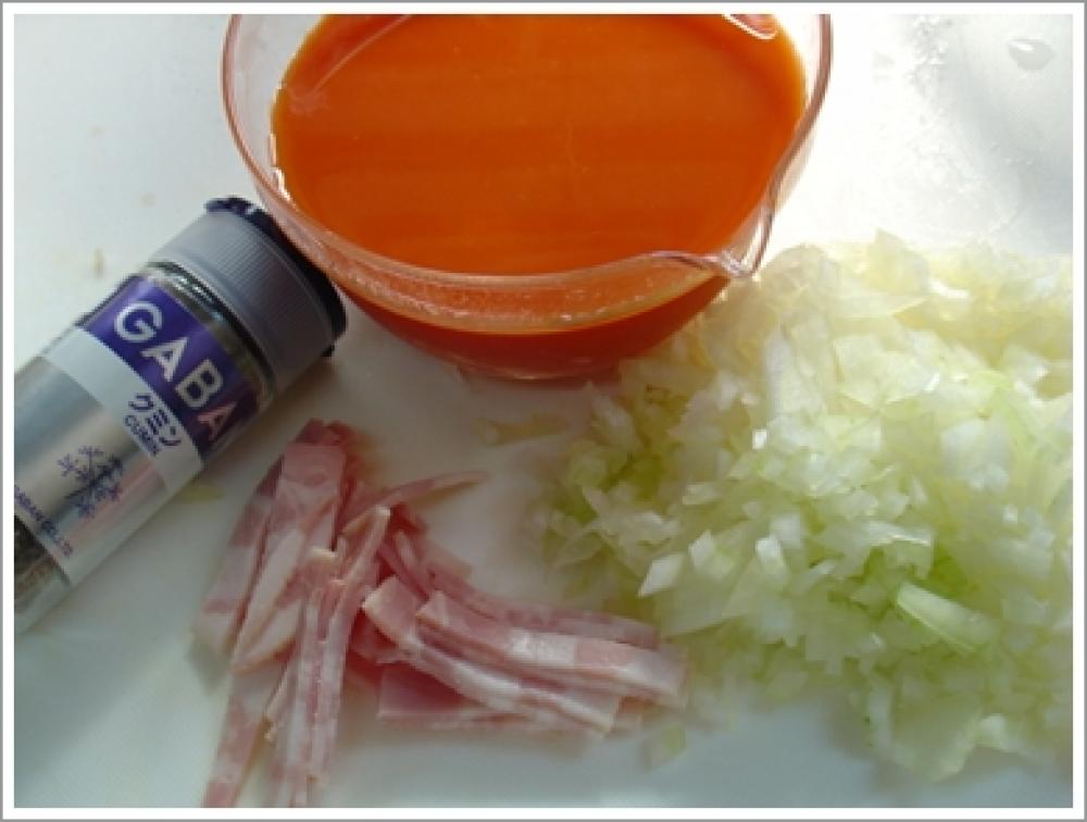 ![]() 野菜ジュースを入れる。玉ねぎとベーコンが炒め終わったら、野菜ジュースをお鍋に入れます。