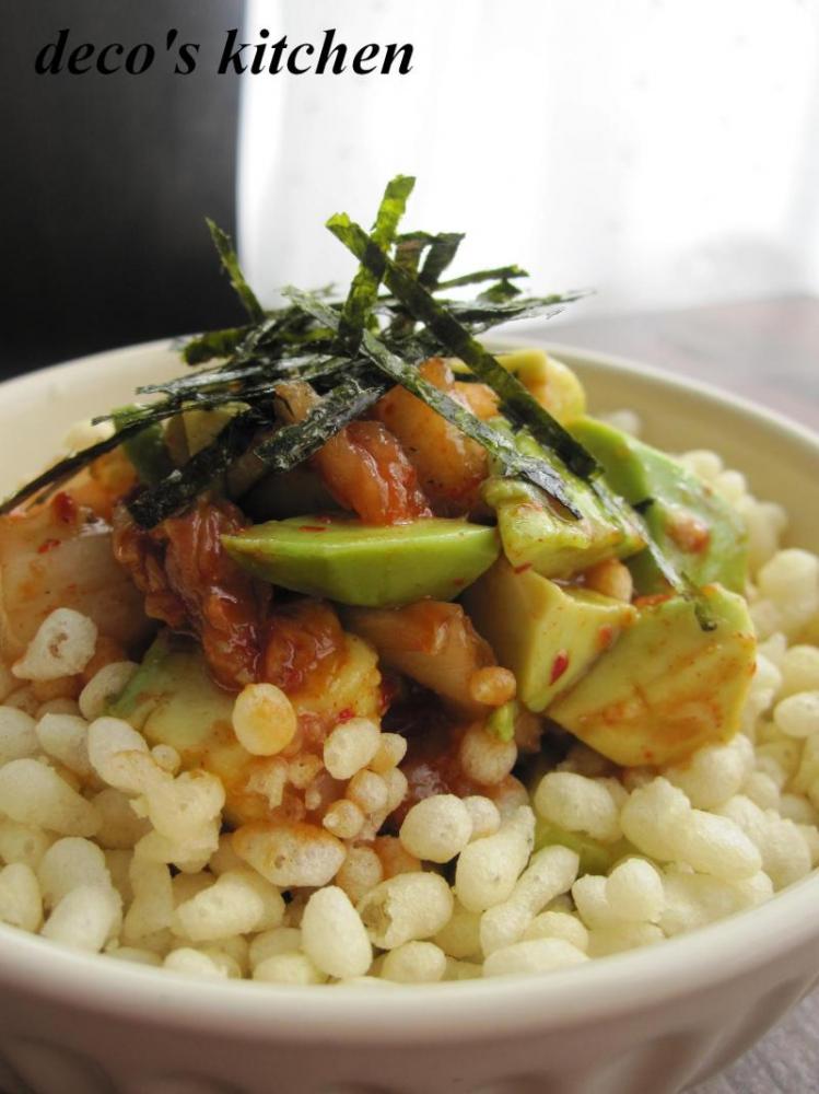 ボールに、1cm角くらいにカットしたアボカドと、軽~く汁気をきって粗く刻んだキムチを入れ、★の調味料と和えておく。