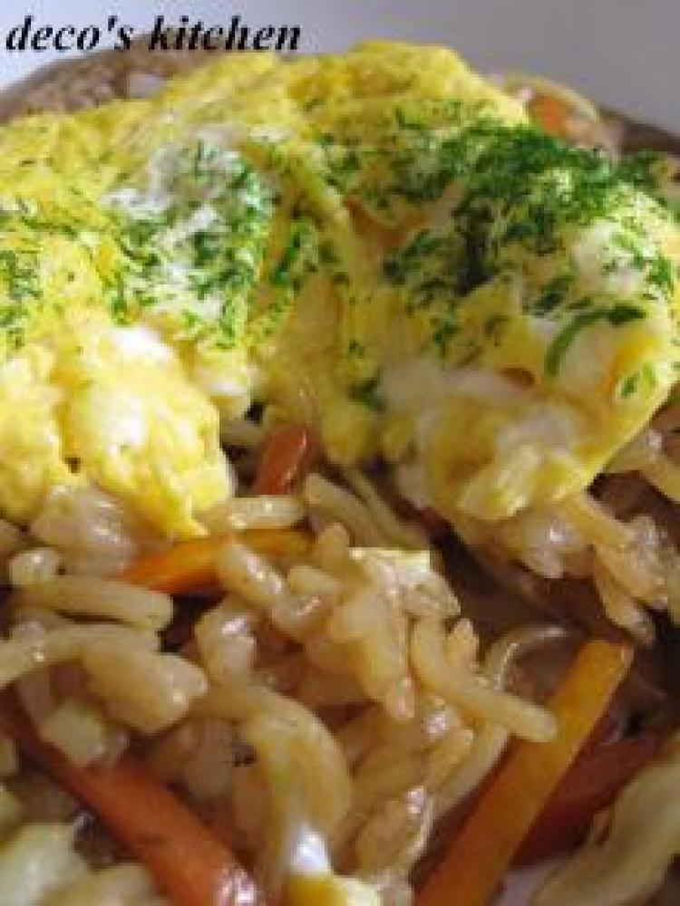 野菜も炒まったら、あたためたご飯を投入し炒める。続いてほぐした麺を投入し、トントン麺を刻むようにしながら混ぜつつ炒める。