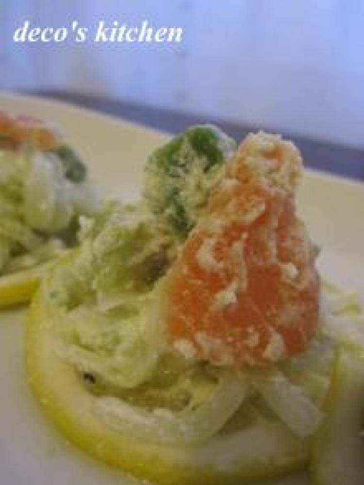 カッテージチーズに4種のペパーミックスを加えてよく混ぜ、そこに、サーモン+アボカド+玉ねぎを加えて、和えたら完成♪