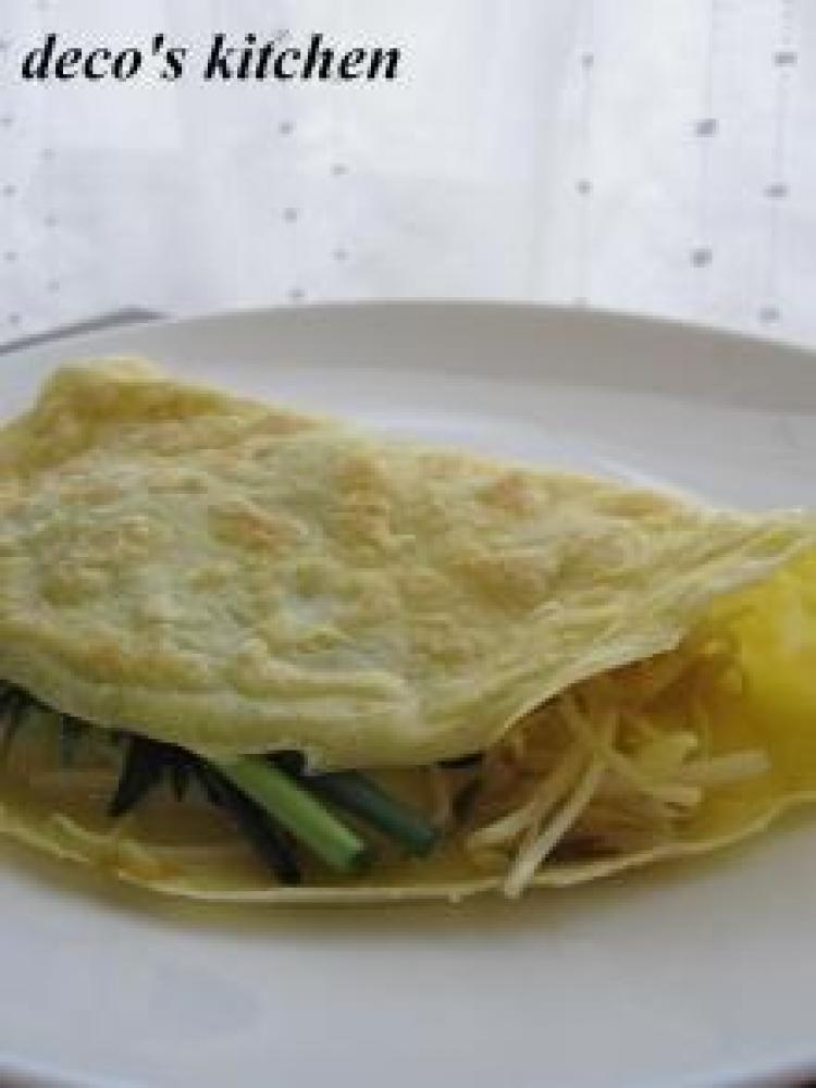 フライパンに、オリーブオイル大さじ1をひき、生地をお玉一杯分流しいれ、クレープを焼く要領で、手早くうすく伸ばす。