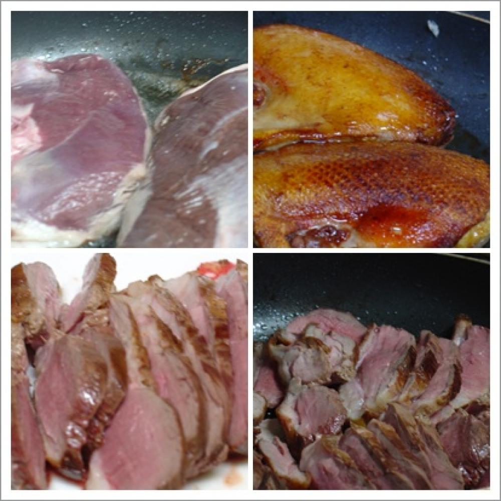 ![]() 焦げ目がついたら、まな板に鴨肉をあげてスライスする。