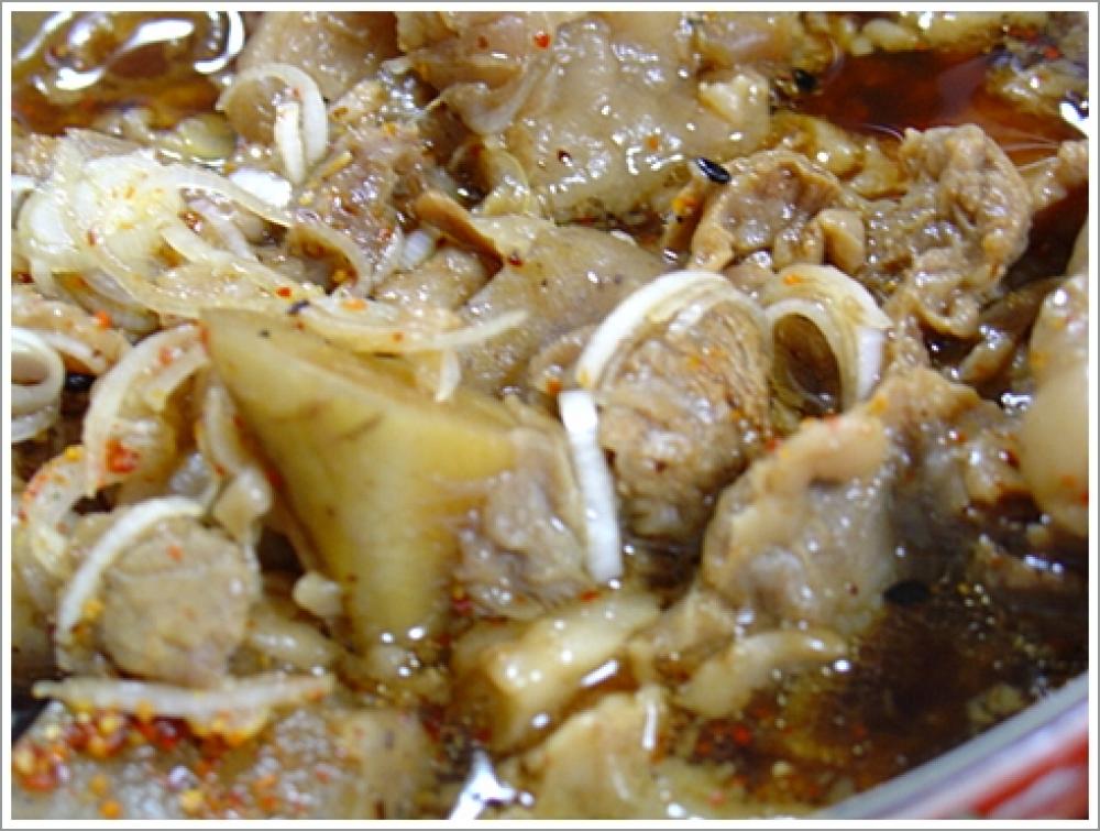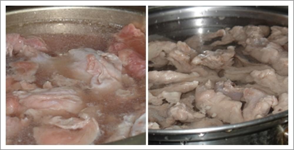 ![]() (沸騰するまで火にかけ、煮立ったらお湯をすてて、筋肉を綺麗にお水で洗います)