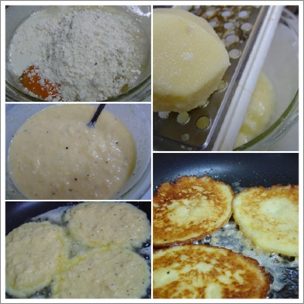 ![]() ジャガイモと玉ねぎをすりおろし、1に混ぜてバターと溶かしたフライパンで焼く。