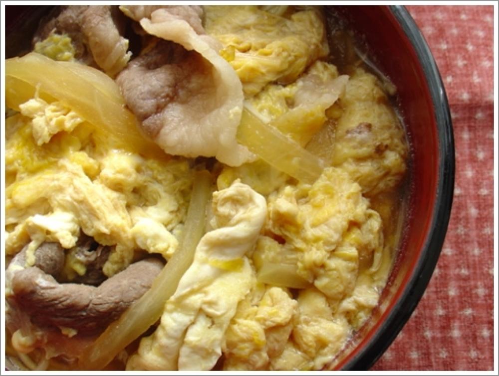 最後にお肉を入れて、だし汁に卵を落とし、かき玉風に仕上げる。