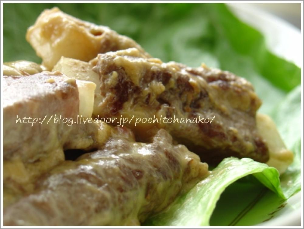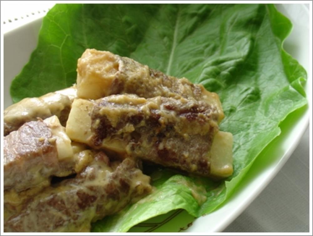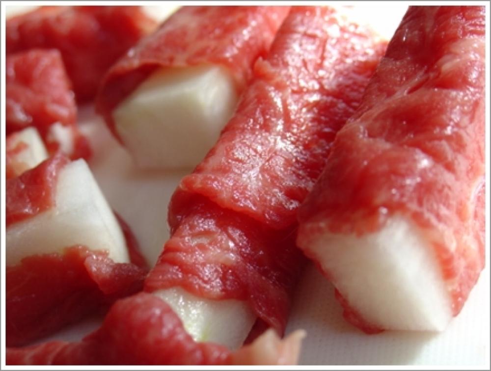 ![]() 大根を1センチ程度の拍子切りにし、牛肉で巻く。