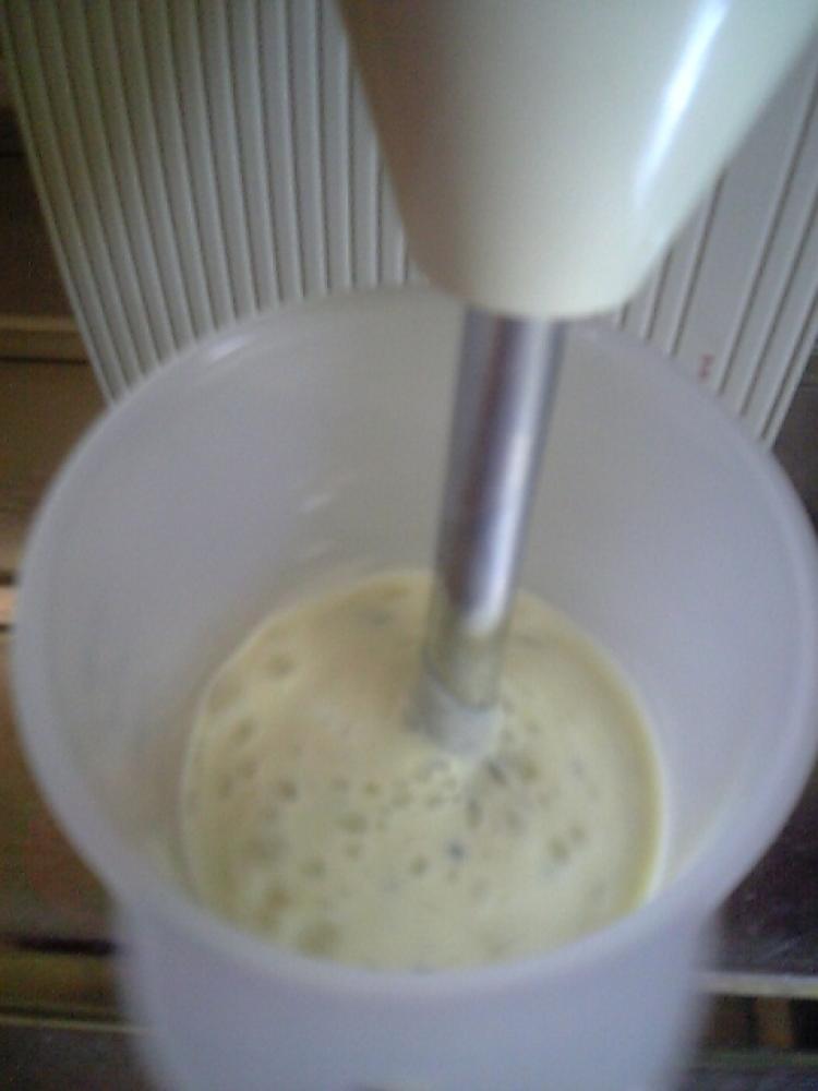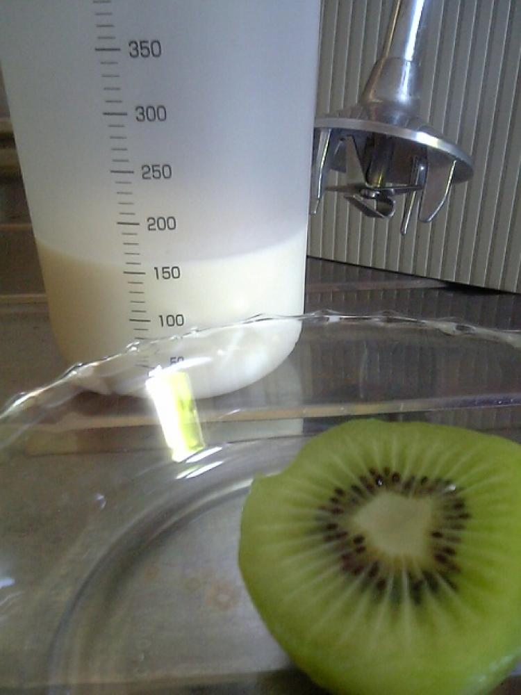 ![]() 豆乳とキウイをミキサーにかけ、なめらかになるまで攪拌します。豆乳のたんぱく質にキウイの酵素が反応し、とろとろになります。