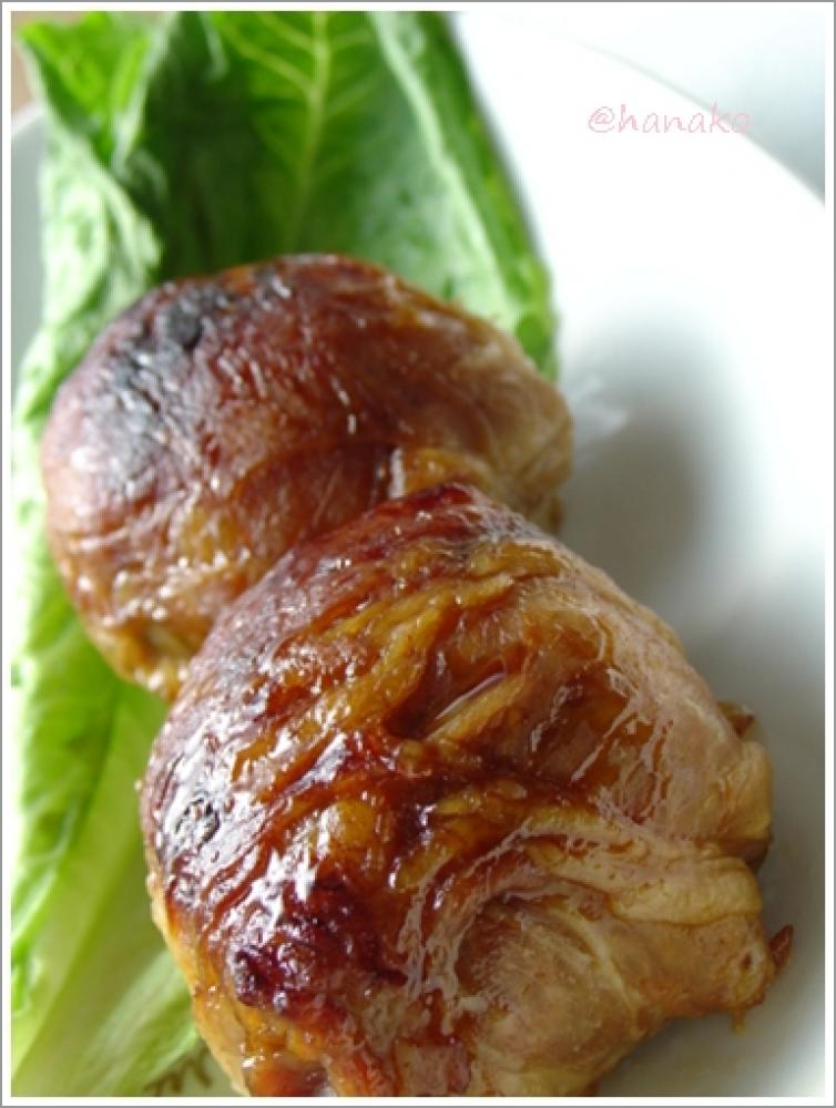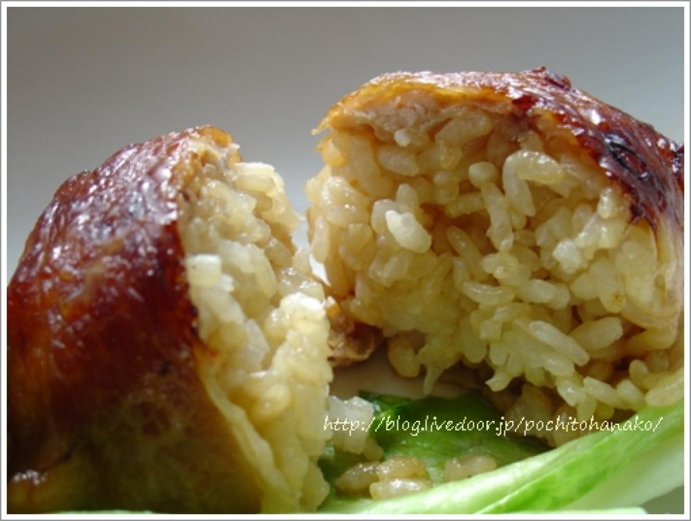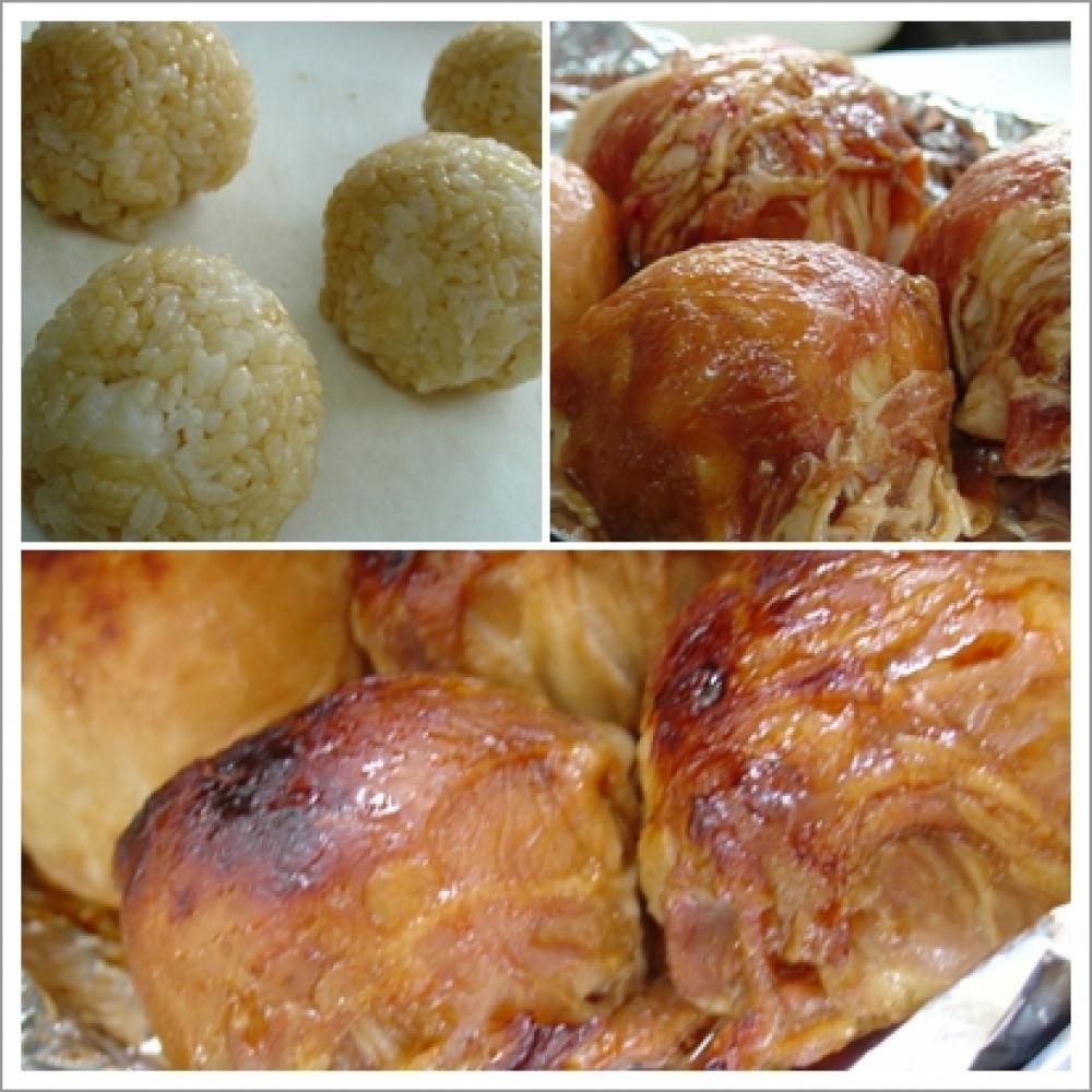![]() 漬けだれに漬け30分置いておいたお肉2枚を使っておにぎり1個を巻く。