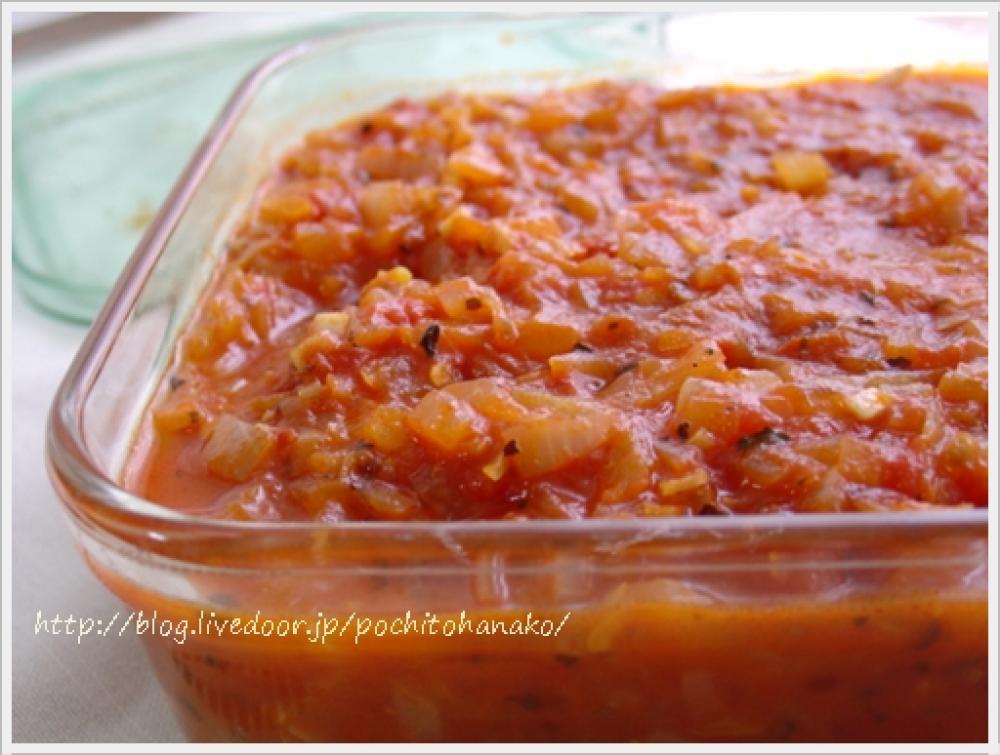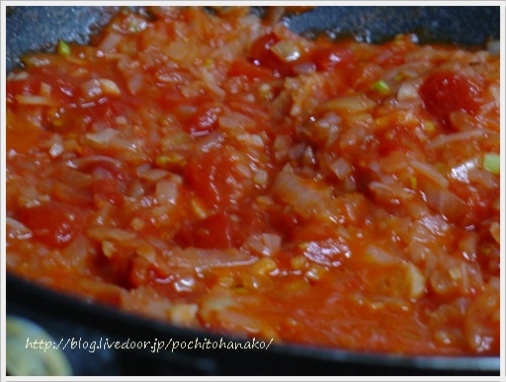 ![]() 焦げる前に、玉ねぎのみじん切りも加え、玉ねぎが透明になったら、カットトマト缶を加え、玉ねぎが柔らかくなるまでコトコト煮る