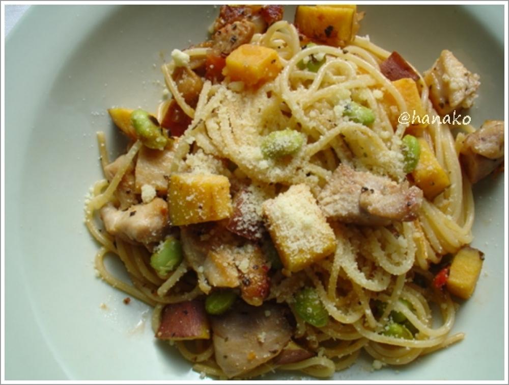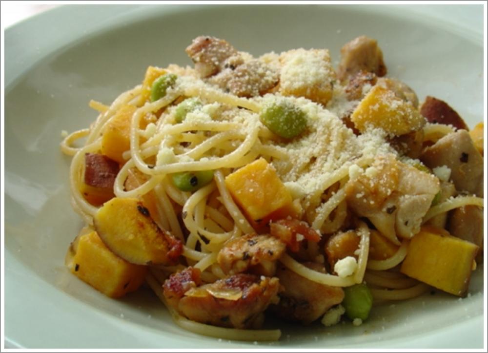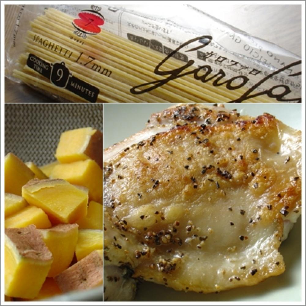 ![]() 最後の仕上げに入れるサツマイモ。ねっとりして甘いものを使うのがオススメ。パスタに微妙なとろみが出ます~。