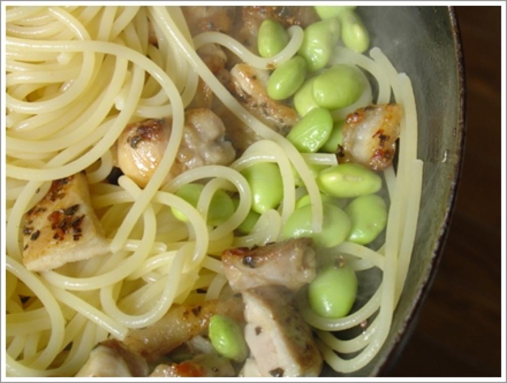 ![]() 2の鶏肉と3の枝豆加えて混ぜ、最後に鶏肉を入れてから、塩・コショウで味を調える。
