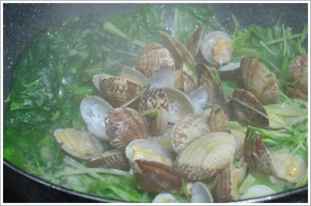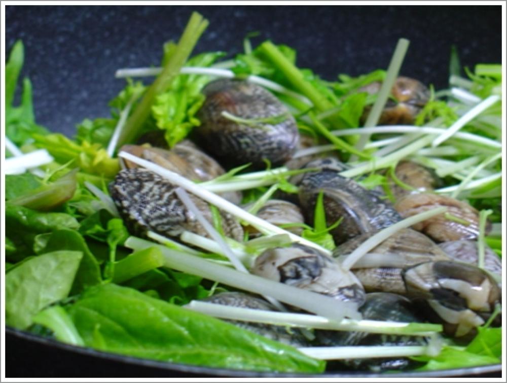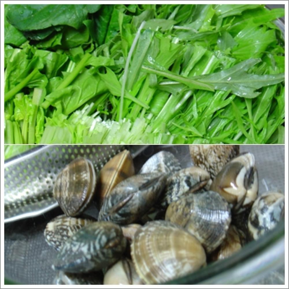 ![]() フライパンに洗って5~8センチに切ったお野菜を並べ、上にアサリを乗せて蓋をし、強火にかける。