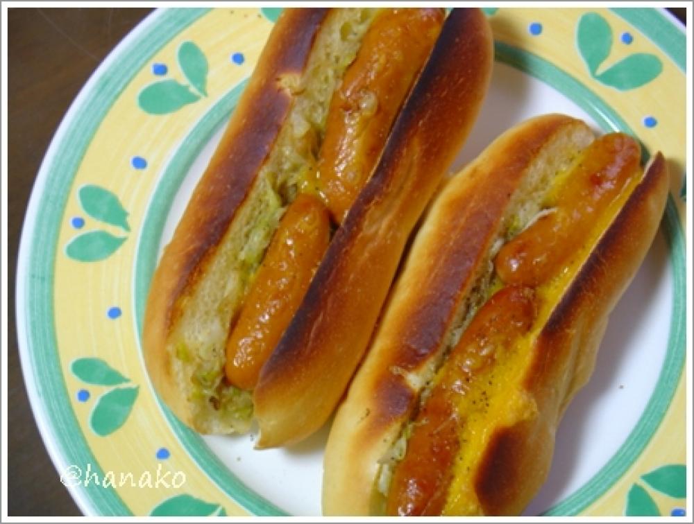 半分に切れ目を入れたホットドッグ用のパンをオーブントースターで温め、お好みでマーガリンとマスタードを塗る。