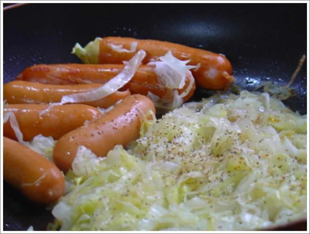 キャベツは粗い千切りにし、バターでしなっとするまで軽く炒め、同じフライパンでウインナーも炒める。