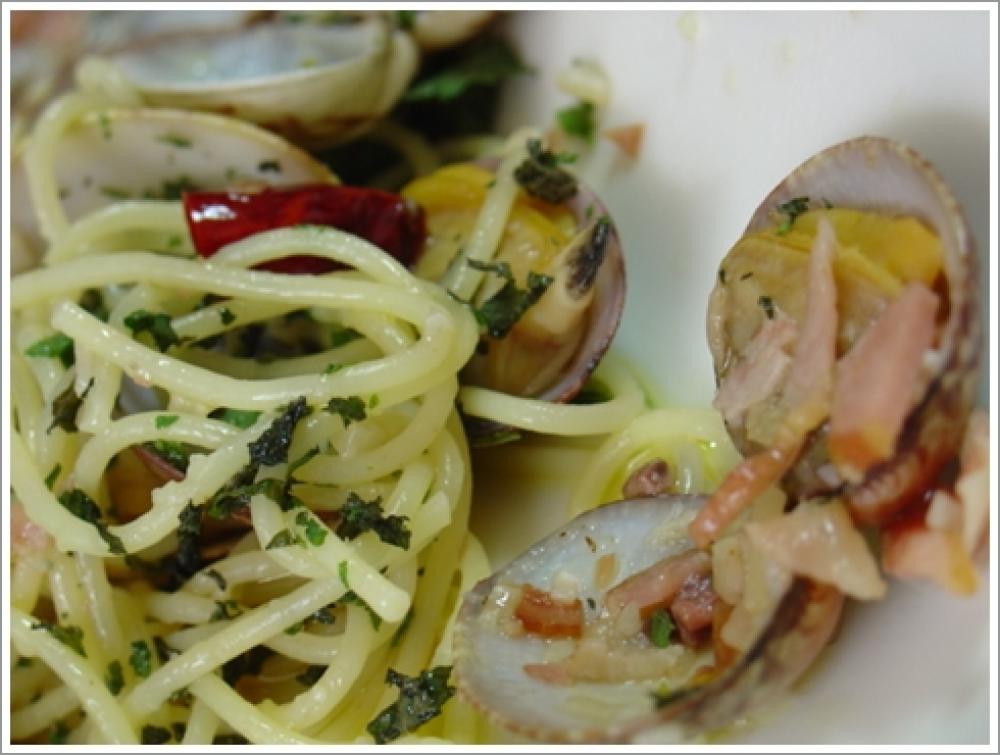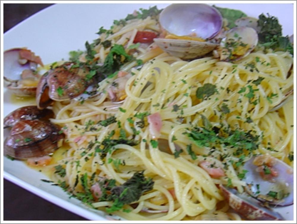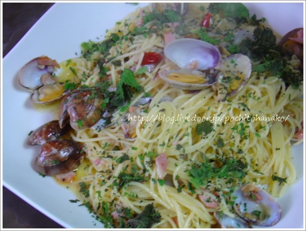 ニンニクの色が変わる前に、アサリを加えて蓋をし、アサリの口開いたら、ソースの完成。