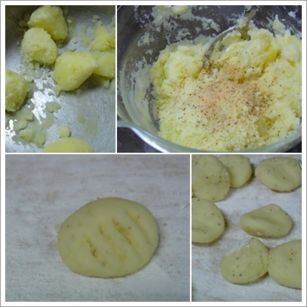 ![]() 1のジャガイモをつぶし、小麦粉を加えて良く混ぜる。最後に彩塩「伊太利塩」で味付けをする。