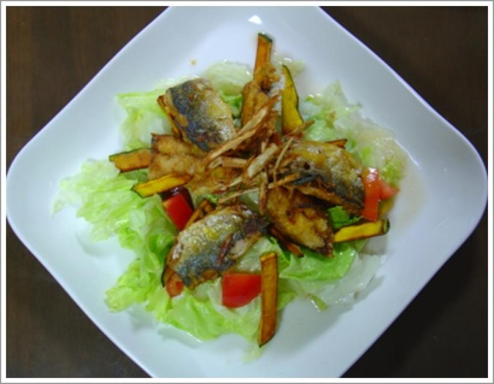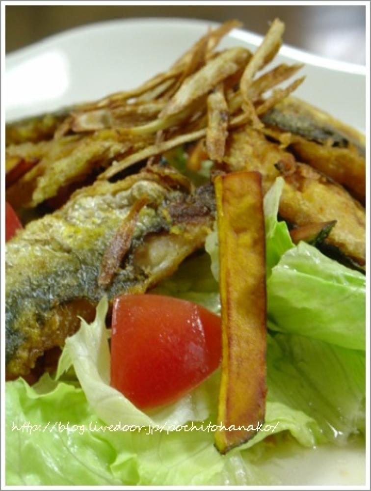 ![]() 下味をつけた1のアジに片栗粉をつけ、少量の油で揚げ焼きにする。※カリっと揚げるので、皮つきにしました。