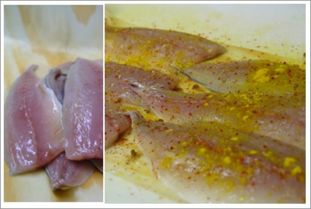 ![]() 小アジは3枚に卸し、小骨とゼイゴを取り調味料Aで下味をつける。