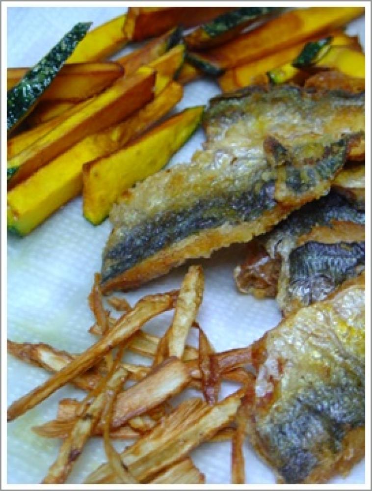 ![]() そのあと、拍子切りにしたカボチャと、ささがきにした牛蒡を素揚げする。
