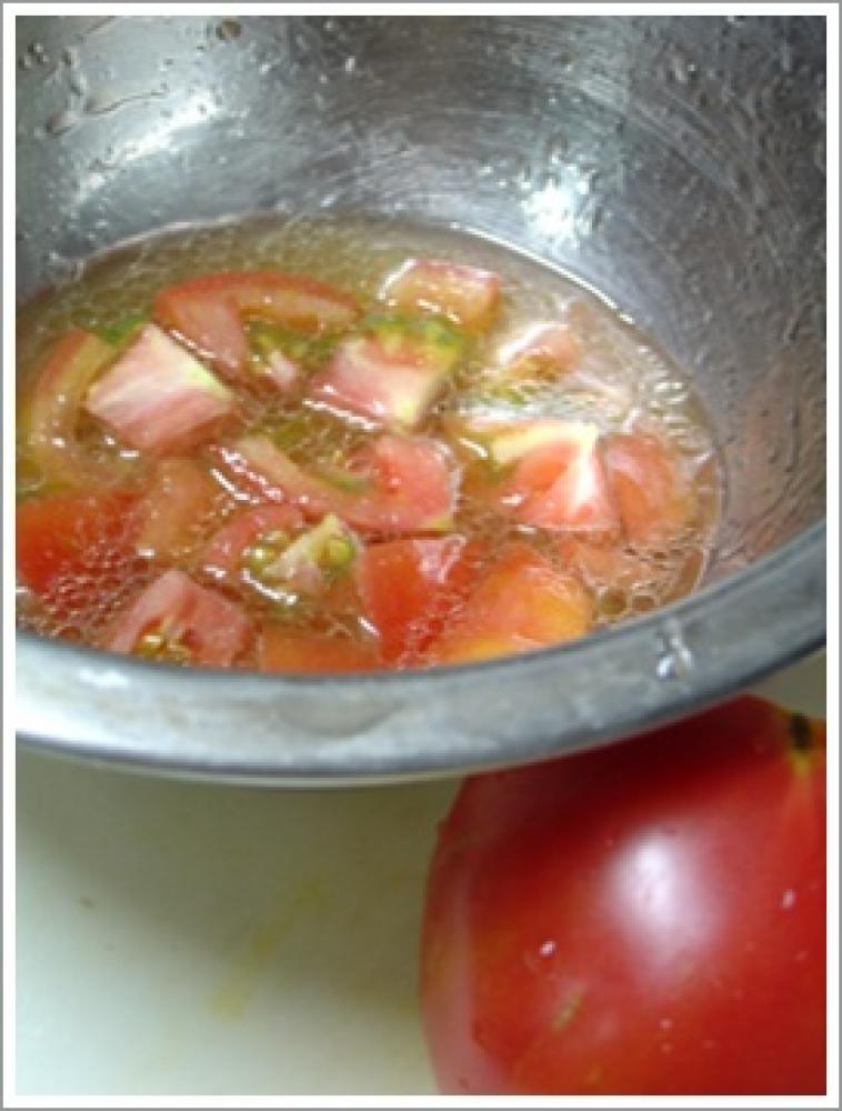 ![]() サイコロ状に切ったトマトを、調味料Bの中に入れ、下味をつけておく。いわゆるフレンチドレッシング味です。