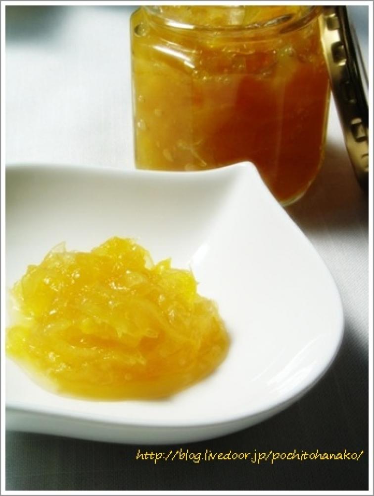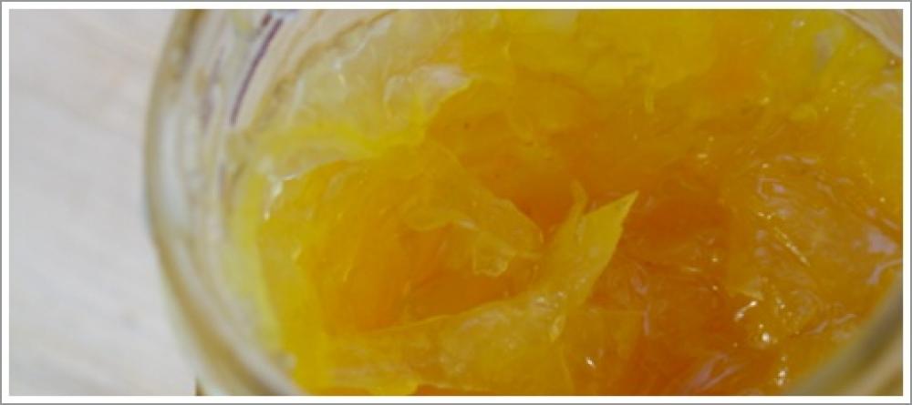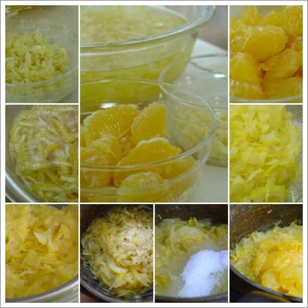 ![]() 甘夏の皮を綺麗にたわしなどで良く洗い、四つ割にしてから、皮にワタの部分が多く残るようにして、皮と果肉に分ける。
