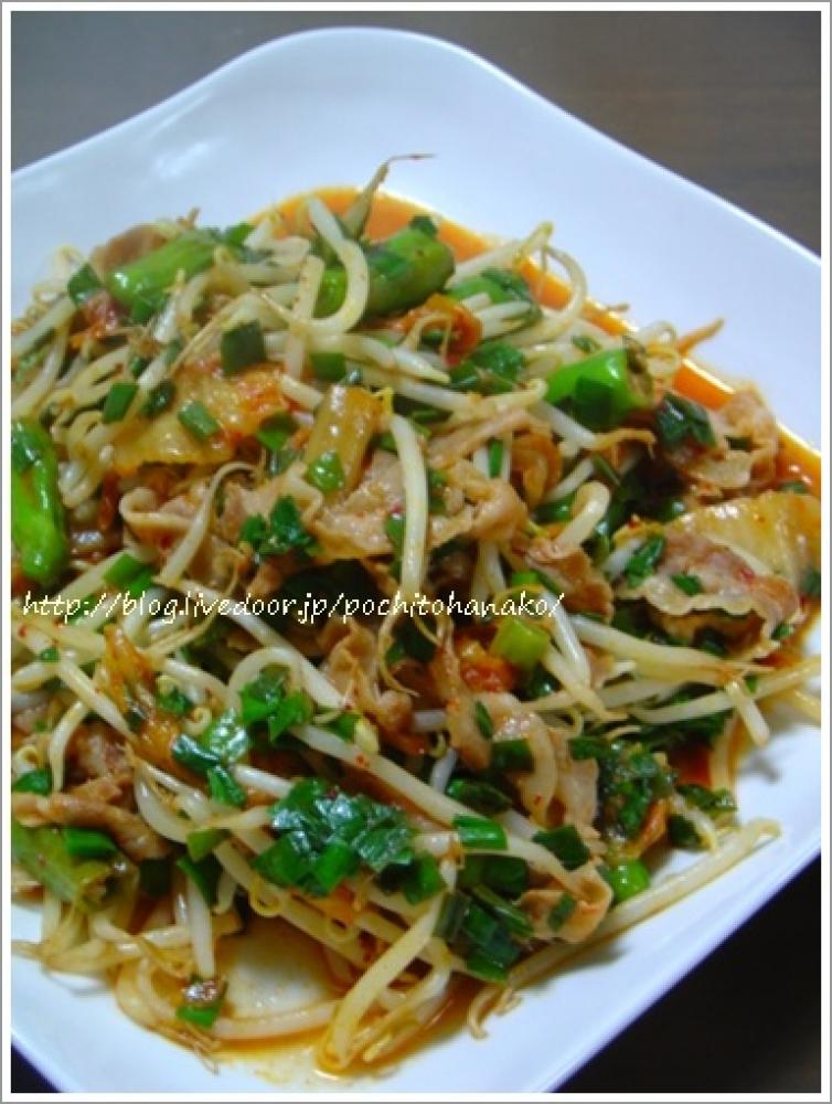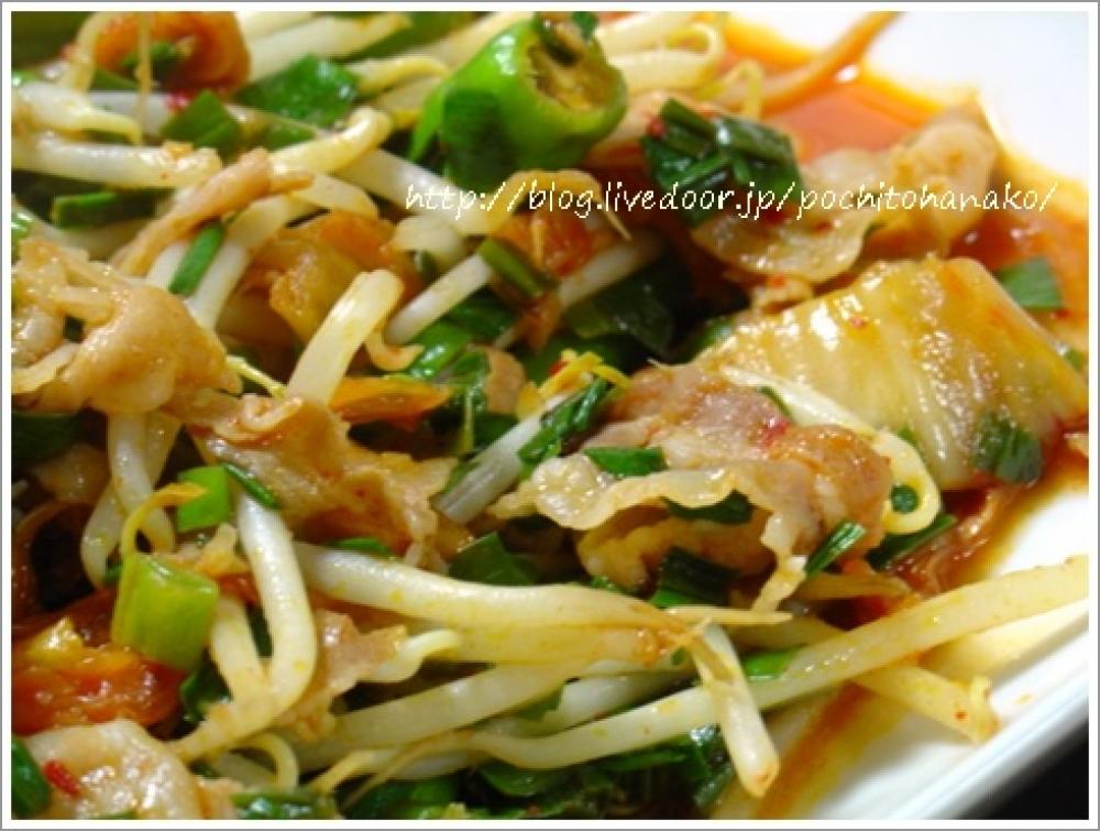 もやし、ししとうを1に加え、火が通ったら、ニラと調味料を加える。