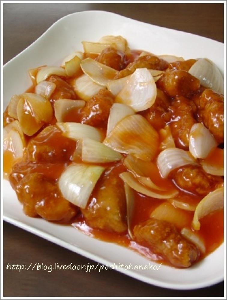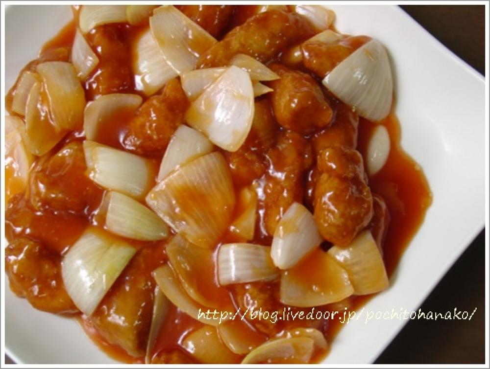 酢豚のお肉は、少量のお酒。それに生姜醤油で下味をつけてあります。そのあと、片栗粉をまぶして油で二度揚げ。
