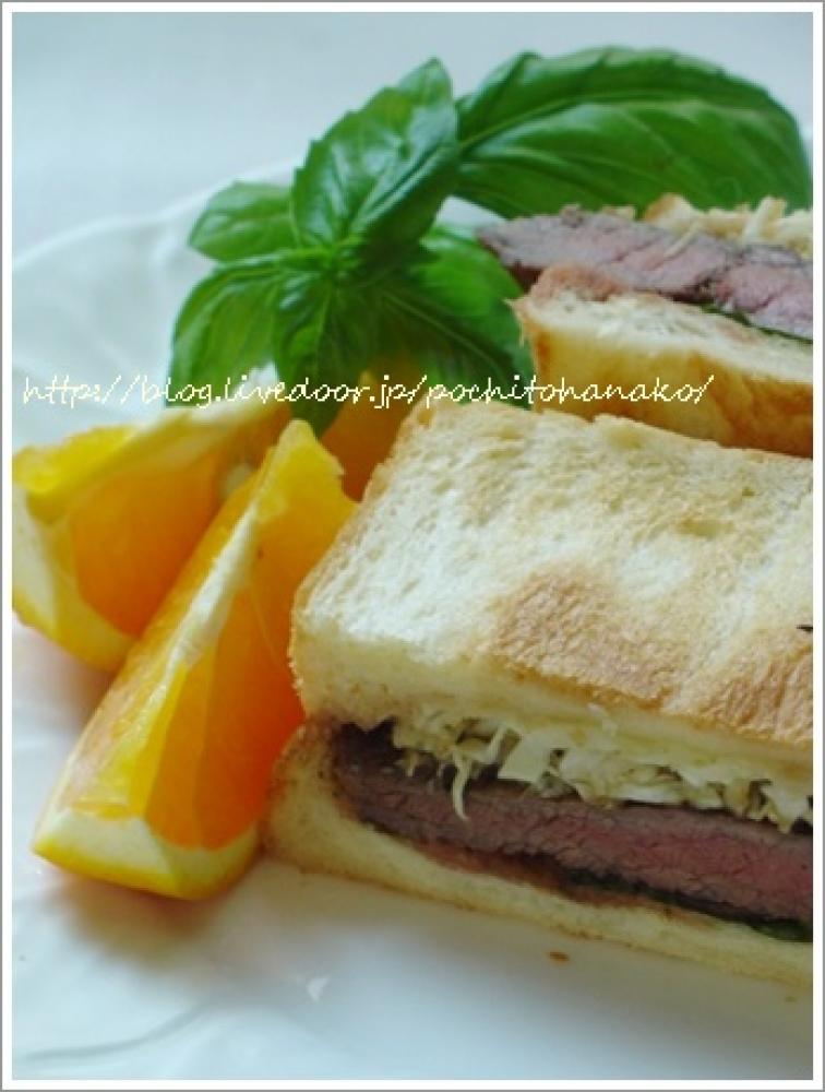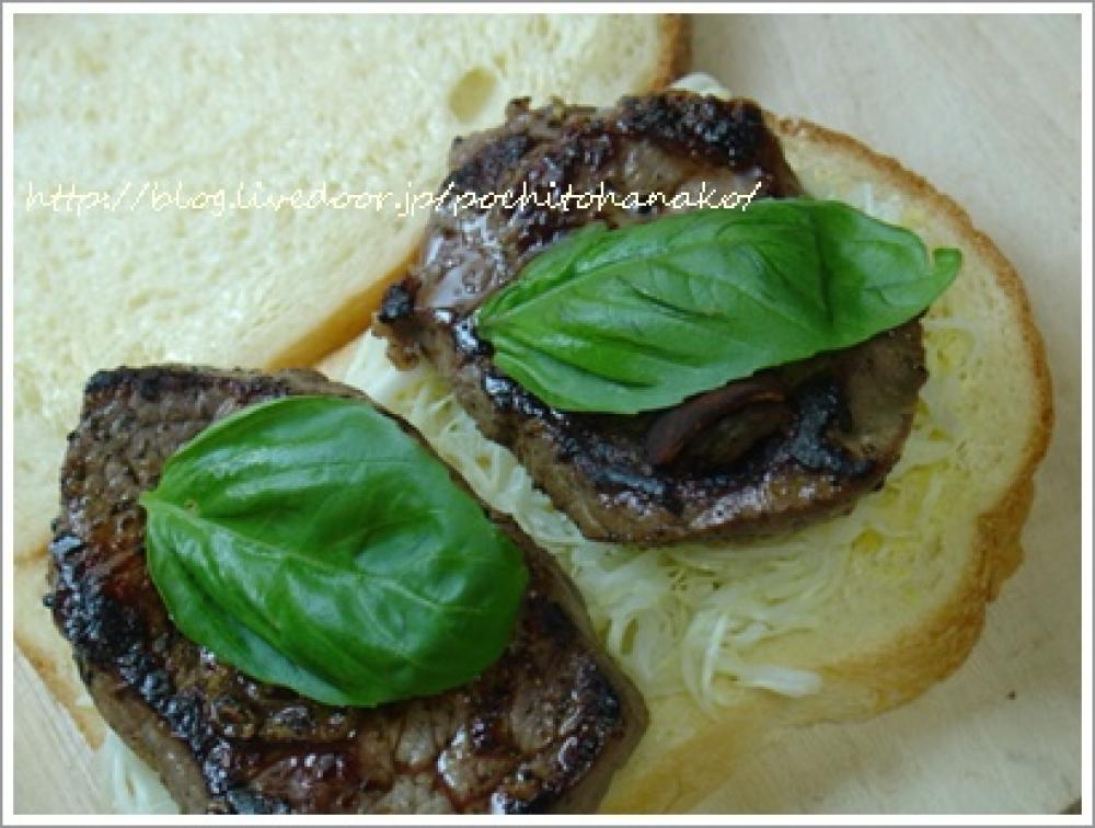 ![]() 3のパンに4のお肉を乗せ、フレッシュバジルを乗せてサンドイッチにする♪食べる直前に、トースターで温めて下さい。