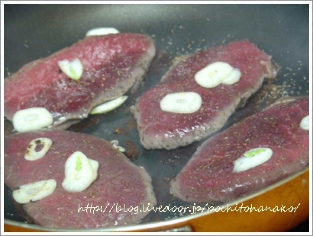 ![]() フライパンにバターを溶かし、1のお肉を入れ、上にスライスニンニクを乗せて焼く。