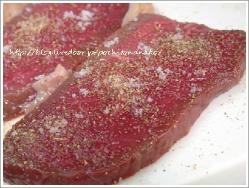![]() お肉は1センチ弱のスライスにし、お肉の周りの筋を良く切って、叩いておく。塩・コショウと乾燥バジルで下味をつける。