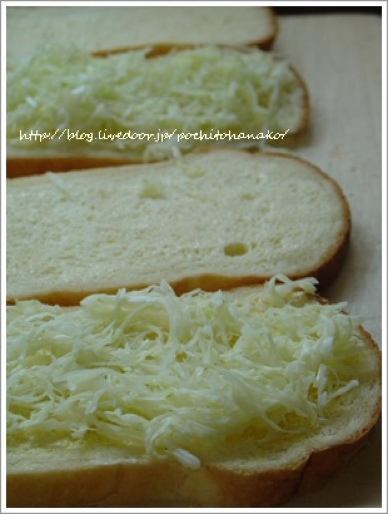 ![]() 千切りキャベツをビニールに入れて30秒ほどレンジにかけ、落ち着かせておいたものをパンの片面に乗せる。