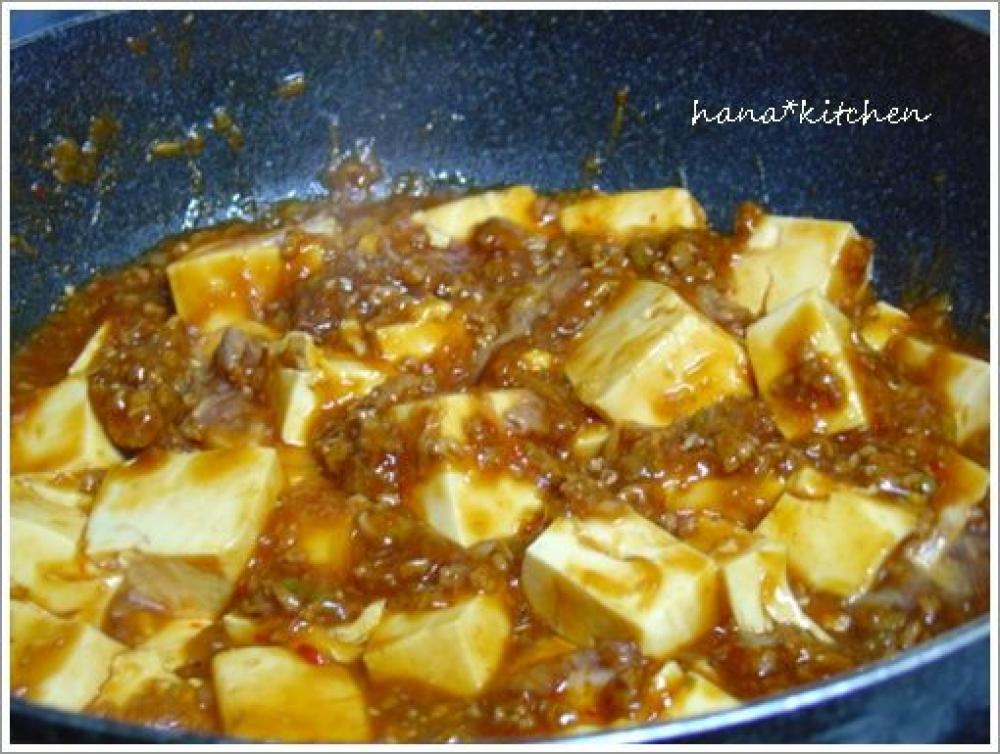全体がぐつぐつしてきたら、水溶き片栗粉でとろみをつけ、最後に水切りして好みの大きさに切った豆腐を加え、