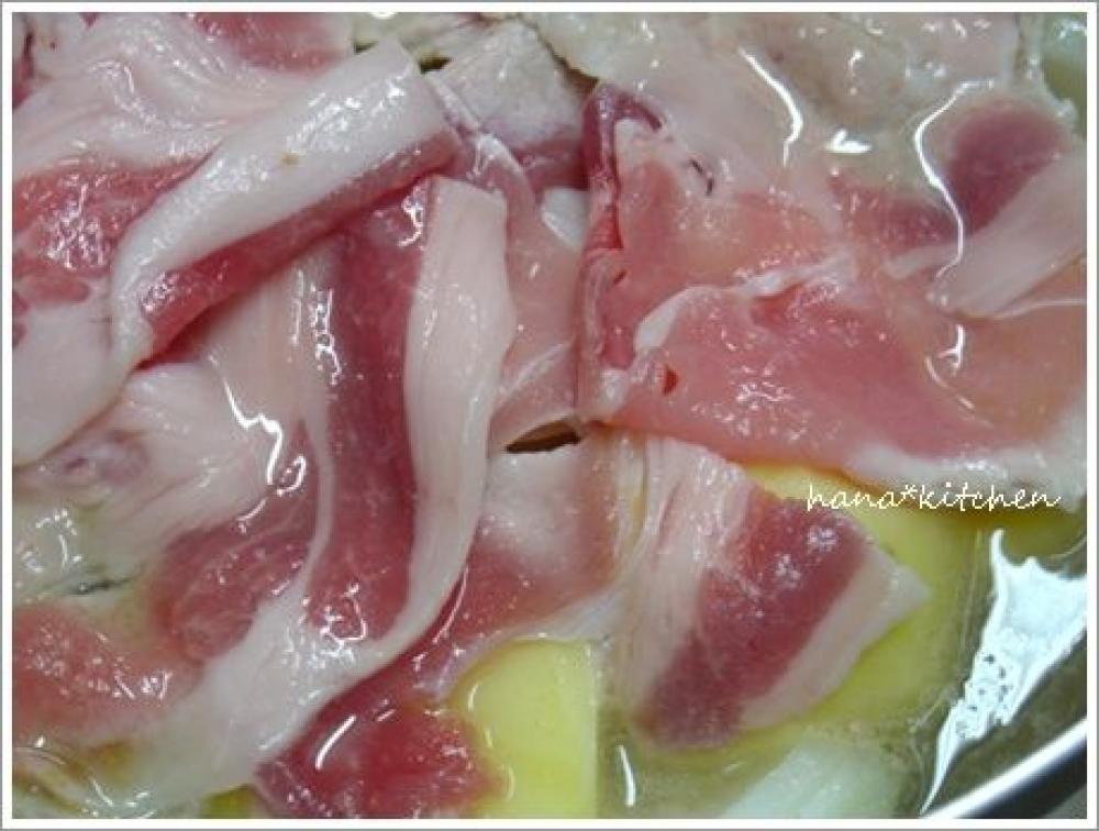 ![]() 煮汁の材料をすべて加え、ひと煮立ちしたら、適当な大きさに切ったお肉を丁寧に広げながら1に乗せる。
