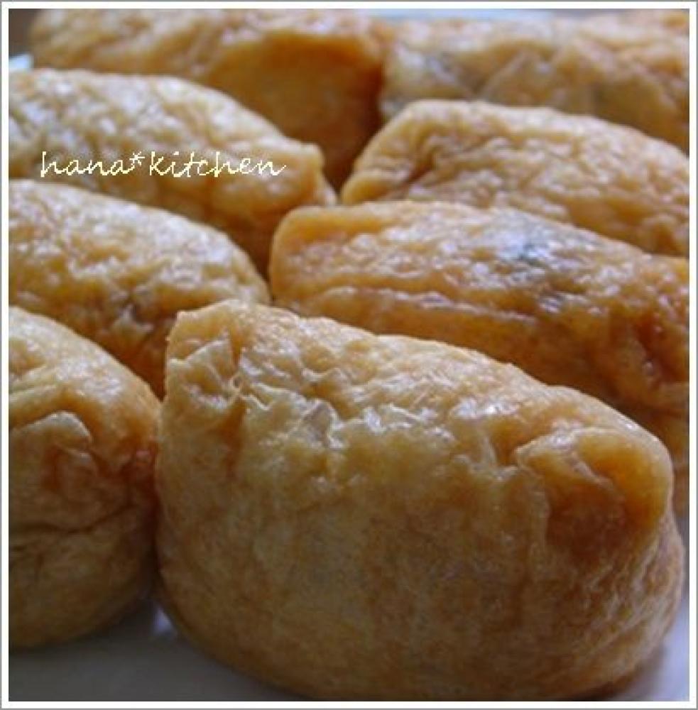 油揚げは二つに切ってから、沸騰したお湯で湯通しする。そのあと、分量の煮汁で煮る。(煮汁がなくなるまで)