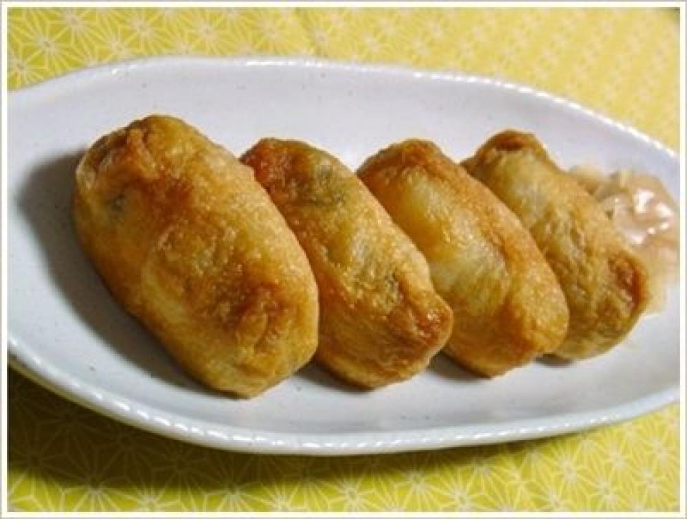 ![]() 3の油揚げの水気を絞り、中に4のご飯を詰める。