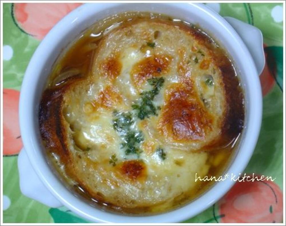 ![]() 2のスープを耐熱のスープ皿に取り分け、フランスパン、チーズ、パセリの順にトッピングをして、