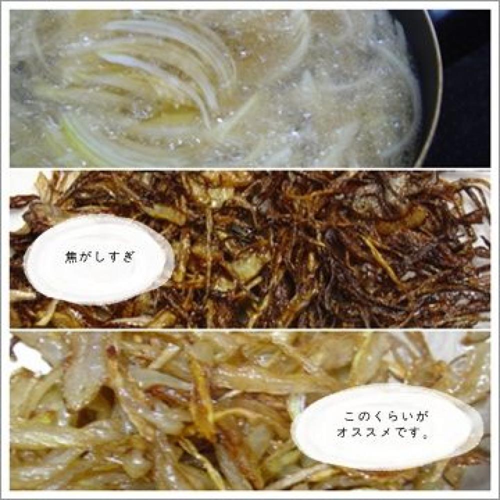 ![]() 玉ねぎを油でアメ色の一歩手前になるまで揚げ、キッチンペーパーなどで油分をよく取る。
