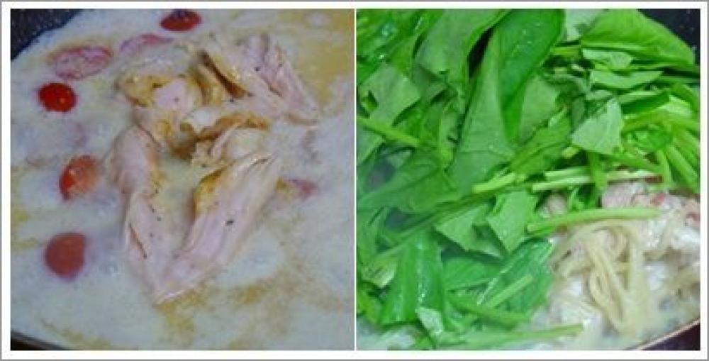 ![]() トマトに火が通ったら鶏肉を加え、豆乳・バターを加えて少し煮詰める。