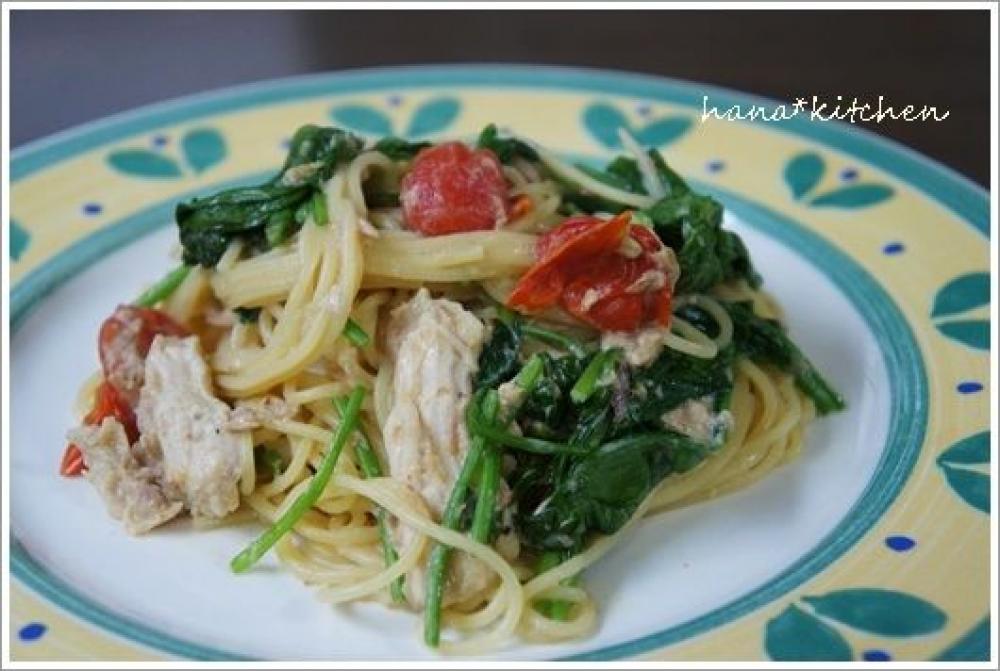パスタが茹であがったら4のフライパンにに加え、最後にほうれん草を入れ、さっとかき混ぜる。