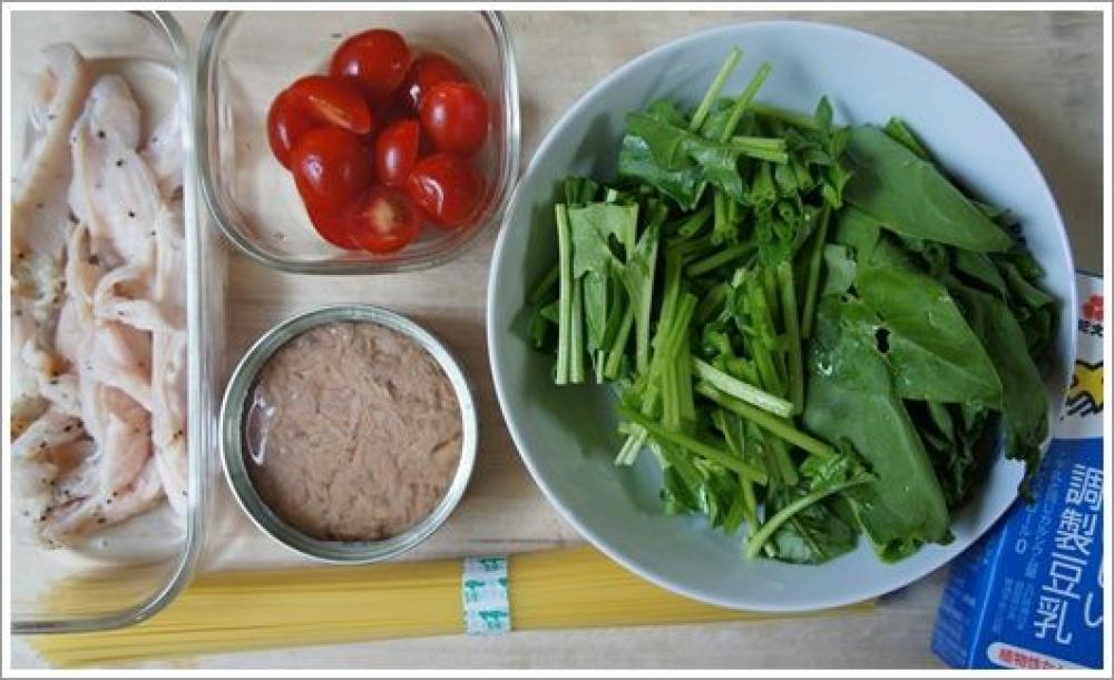 ![]() ほうれん草は洗って5センチ程度の長さに切り、 プチトマトは半分に切っておく。