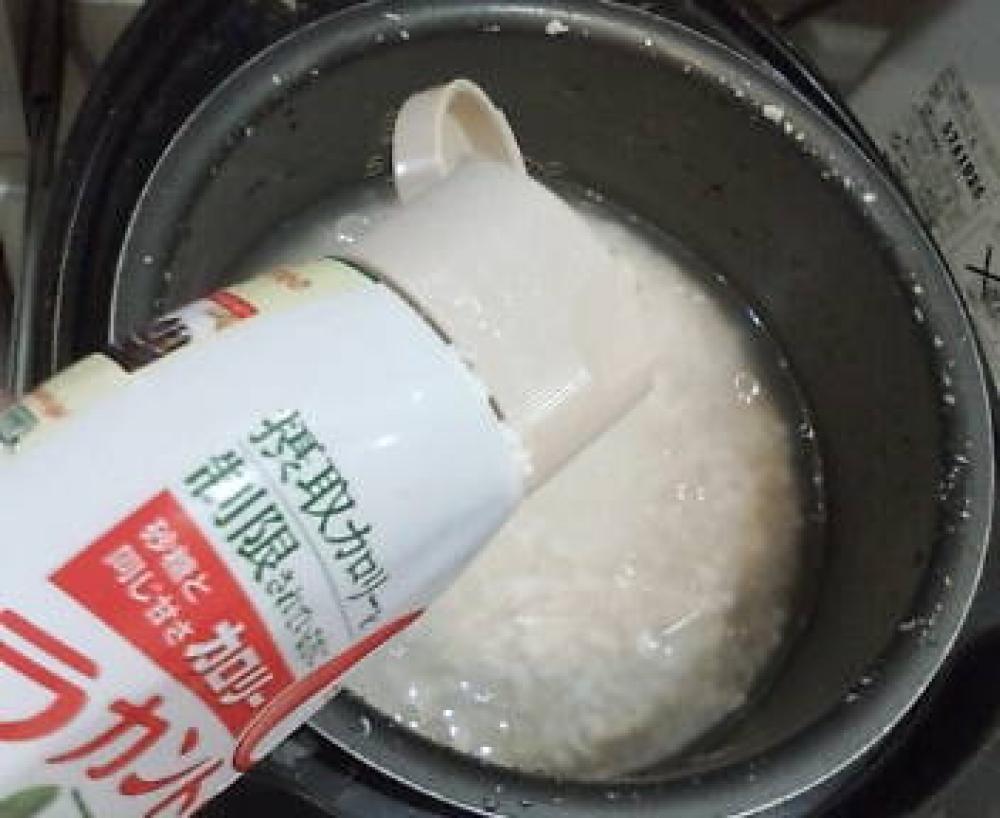 炊飯器で炊く前に 押し麦・太白ごま油・ラカントS液状を入れて、さっと混ぜてスイッチオン |