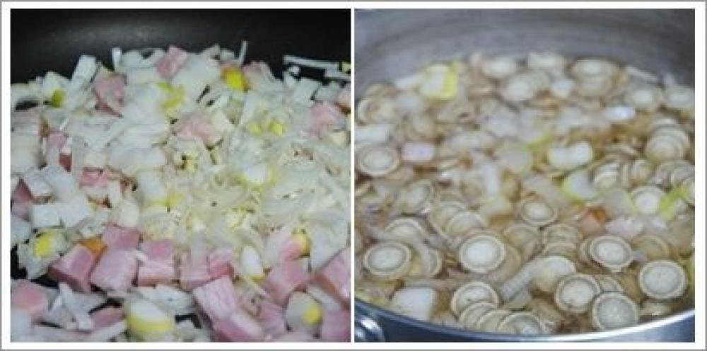 ベーコンを8mm程度の大きさに切ったベーコンと、長ネギのみじん切りを炒める。