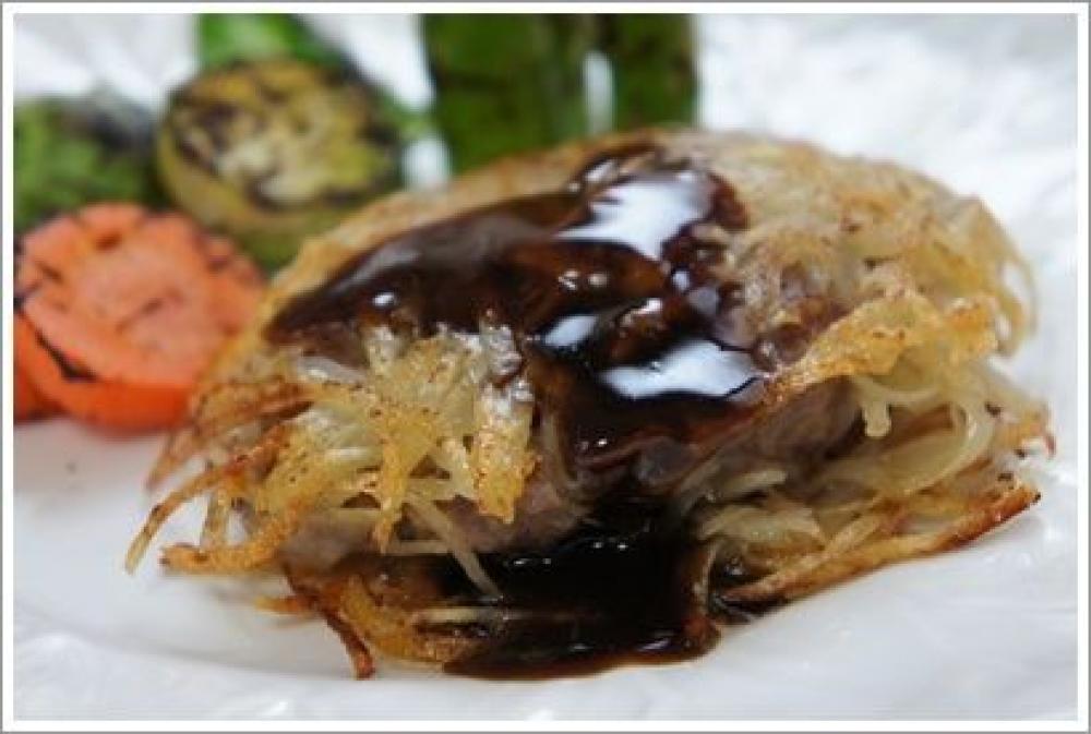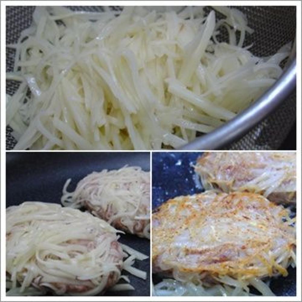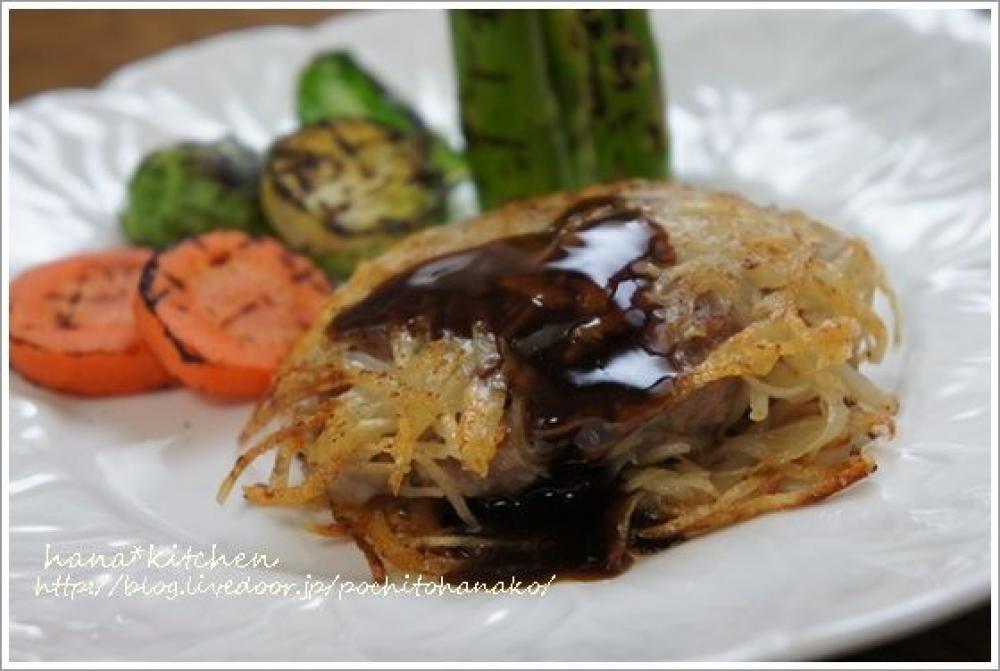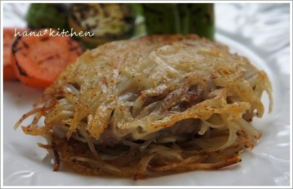 ![]() ジャガイモの千切りでハンバーグを包んで焼いたところ、フリルレースのようなんです。