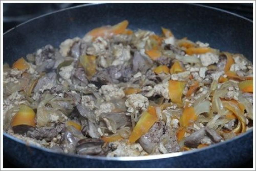 野菜に火が通ったらいったんお皿に取りだし、同じフライパンでレバー・ミンチ肉の順に加えて炒める。