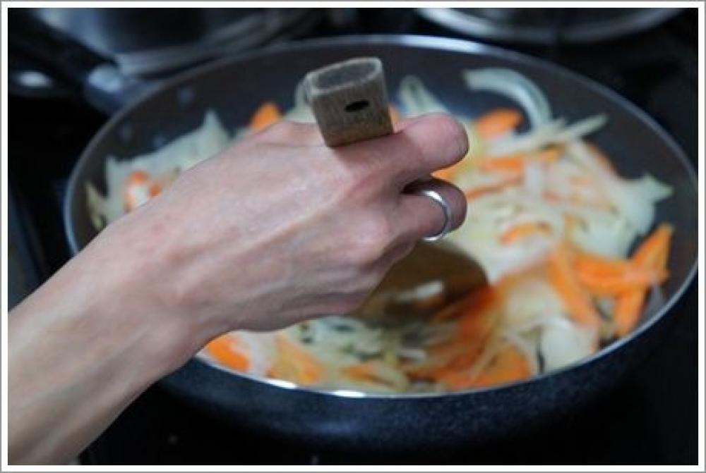 ![]() フライパンにオリーブオイルとニンニクを入れて火にかけ、ニンニクの香りがでてきたら、刻んだアンチョビと残りの野菜を加えて炒