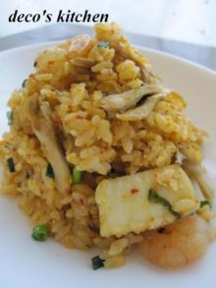 フライパンにサラダ油を熱しシーフードを炒める。舞茸を加え酒大さじ1+塩こしょう少々をふって炒め、キムチを加え、炒める。