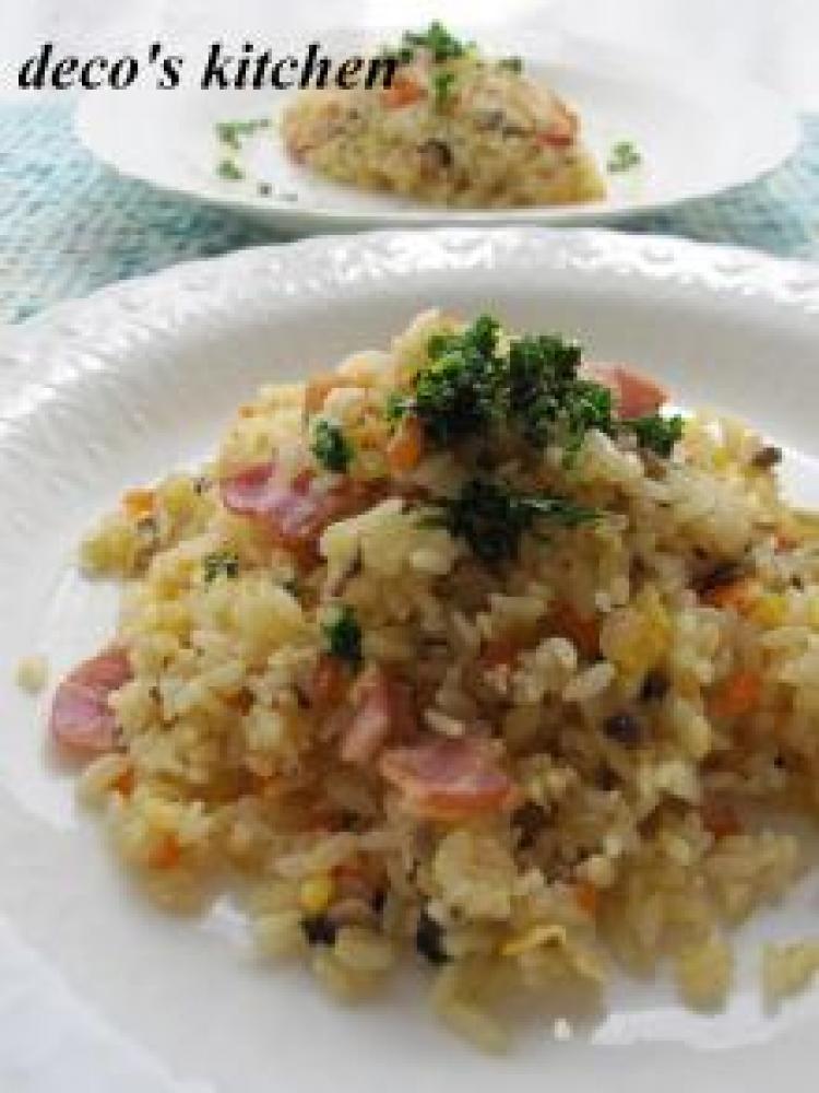 水分が飛んだら、割りほぐした卵を加え、すぐにご飯+塩+「レモンひとふり」も加え、手早く全体を混ぜながら炒める。